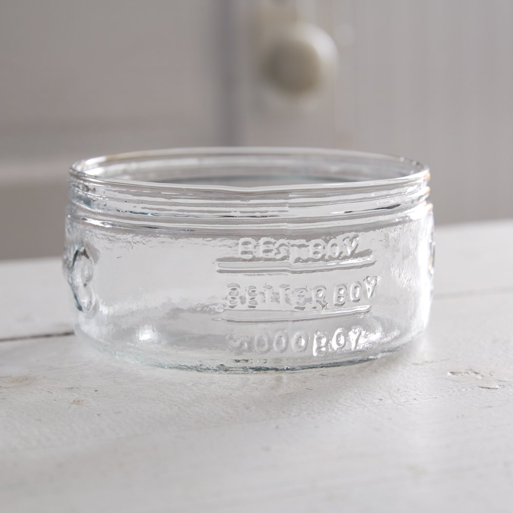 Mason jars are a farmhouse staple. Share your love of all things farmhouse with your furry friends! Our Mason Jar Dog Bowl is created of glass and features embossed lettering with the phrase ''Bones Mason Jar'' on the front. It also features measuring lines that say ''Good Boy, Better Boy, and Best Boy'' and a dog bone.